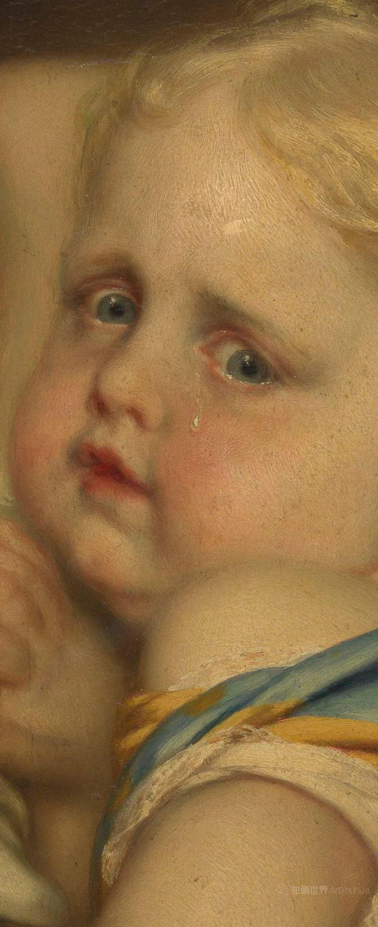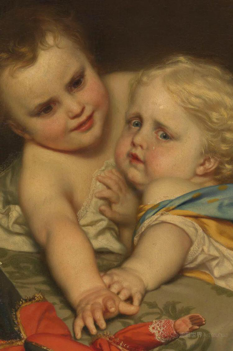 两个孩子在玩耍,互相伸出胖嘟嘟的手去抢夺一个洋娃娃,妹妹没抢到,晶莹剔透的泪珠顺着脸颊滑落!画家把两个孩子的神情刻画得生动逼真,如身临其境!