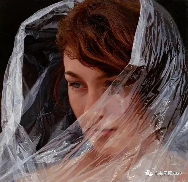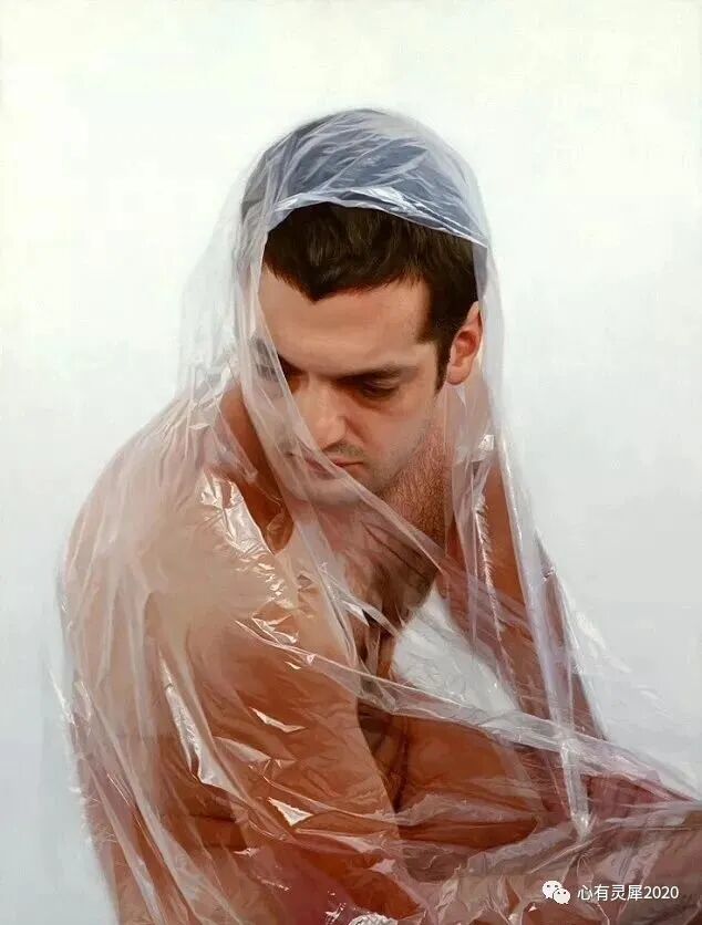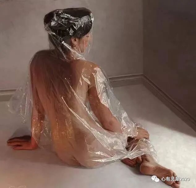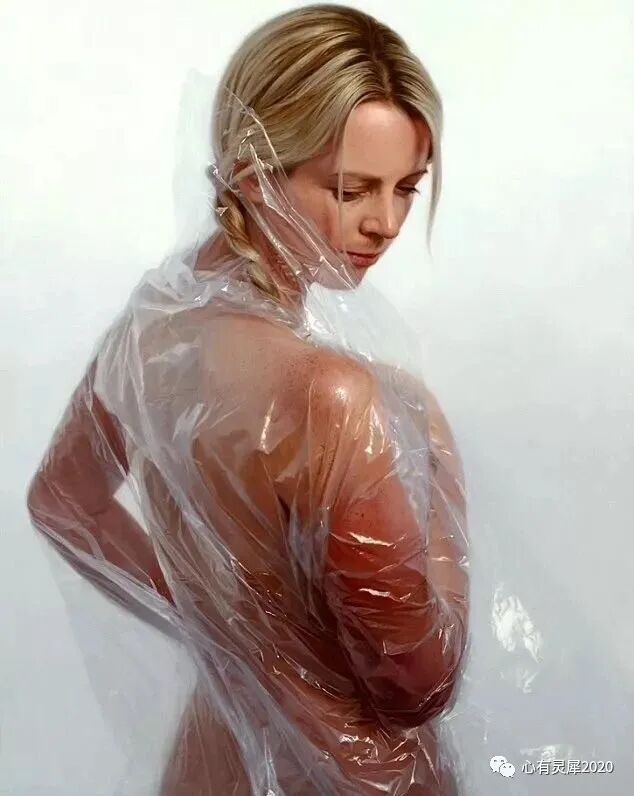 他把这层塑料薄膜和人体有机的结合在一起,天衣无缝,完美无缺,每一个褶皱、每一道光影,都刻画得犹如照片一样细腻逼真!特别是阳光在透明薄膜上和身体上的折射光线,也被他及时捕捉到了,真的是做到了如影随形!