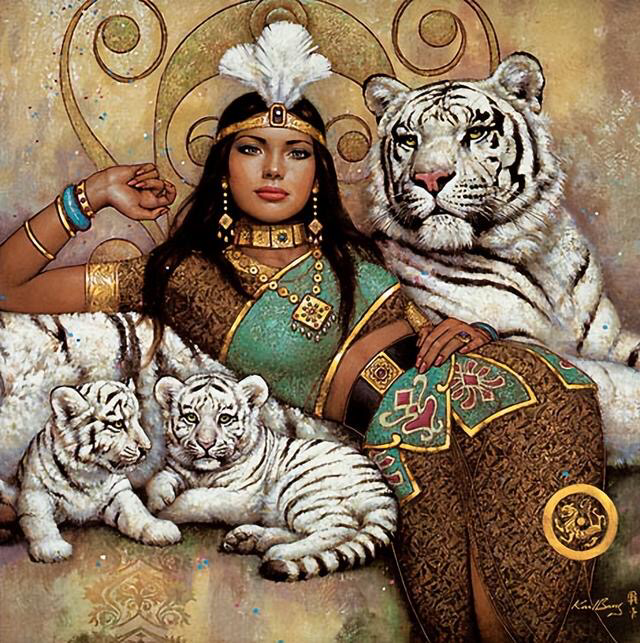 在中国文化中,老虎狮子象征着英雄威猛、驱凶避邪、吉祥如意!在历史传说中,人们把老虎作为开天辟地之神,人类繁衍生息之祖。画家把女性和老虎安置在同一幅画里,应该是指中华儿女生生不息!身处异乡,艺术文化的根依旧还站在原来的记忆里!