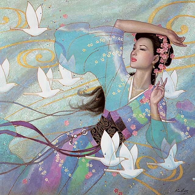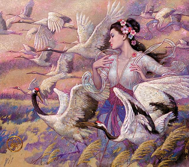 这个应该是属于中华文化中的特色乐器,而女神心生双翼,翱翔在天空,飞越千山万水,这也许是代表画家思念祖国的一种方式吧!