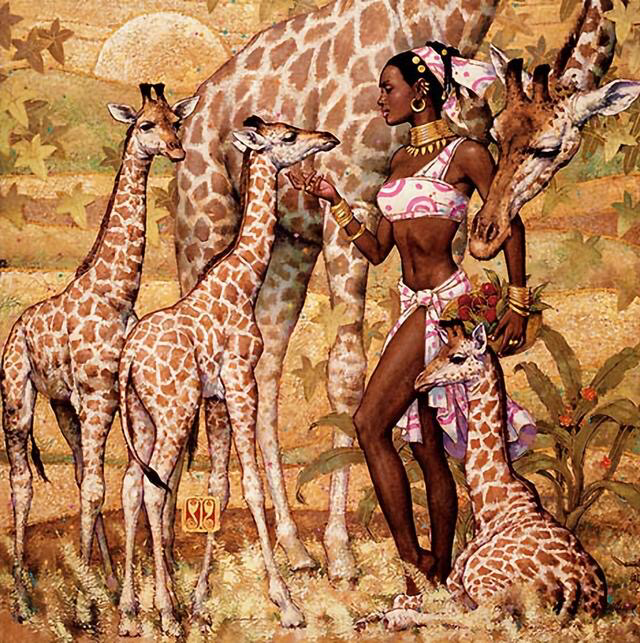 女性的柔情和凶猛的动物朝夕相伴和谐共处,展示了人与大自然融为一体的美好愿望!在现代工业化进程中,我们应该对大自然保持敬畏之心,切不可为了一己之私欲,而破坏生态平衡!