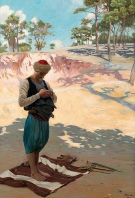 再看这幅画的处理方式,其色彩搭配和周围的背景氛围,构图处理方式与上面第一幅画有诸多相似之处!所不同的是模特站在树荫处的地垫上,从地上的工具和老人的赤脚来看,应该是一位干活的老伙计,也许累了想休息一会吧!