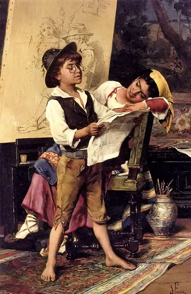 《mischievous models》,母子同乐的一幅画,儿子为了逗母亲开心,戴上了老花镜,开始读报纸给母亲听!画面充满了温暖和欢声笑语,感觉笑声通过画作,感染了我们每一位观者!