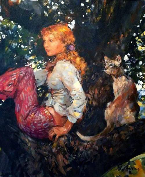 猫咪🐱通常是灵动的,其性情也是变幻莫测的,可以说它能上天入地,那么猫和女孩在一起呢!我们欣赏一下这树上女孩的表情就知道了,感觉是坐在树影婆娑的树杈上,女孩在充分享受阳光下微风吹拂的感觉,画家通过光和影,描绘了此时此刻她从内而外散发出来的愉悦感,当然这种情绪也感染了我们每一位观者!