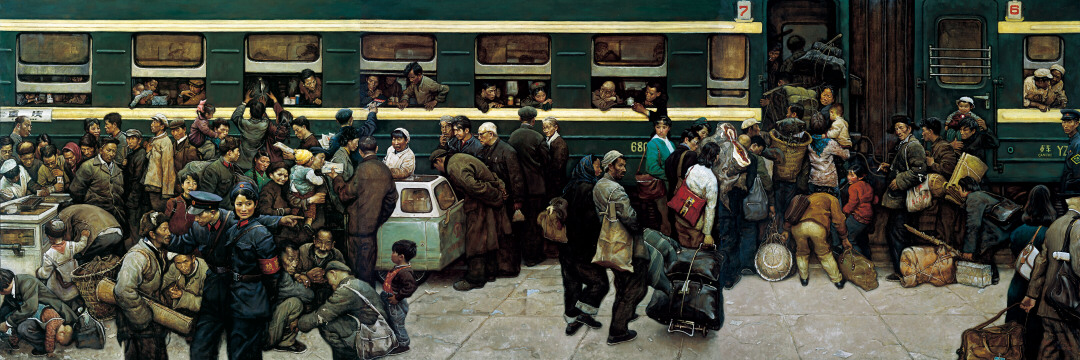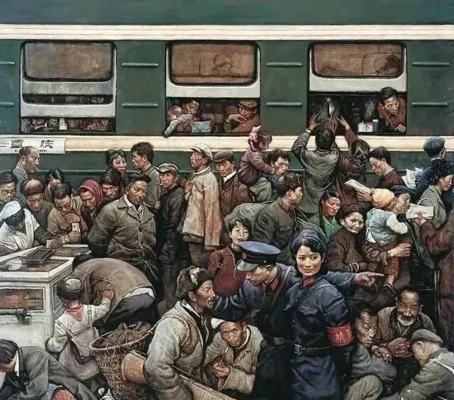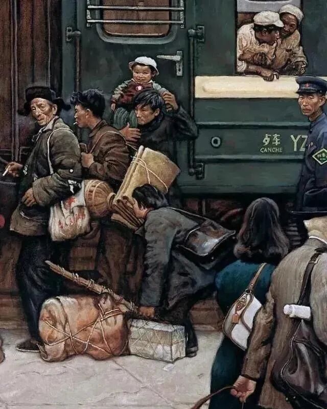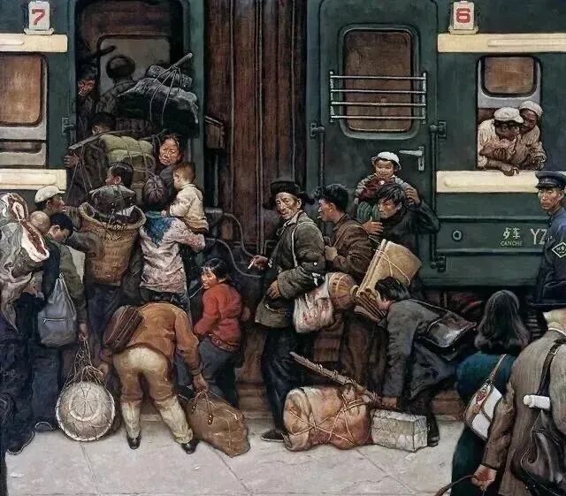 《赶火车》,被誉为油画的“清明上河图”;荣获美国亚太艺术研究院“20世纪艺术贡献奖勋章”。画面上展现的是八十年代普通人扛着行李🧳赶火车的真实经历,拥挤、杂乱、无序,但没有冲突,充满着祥和的气氛!
