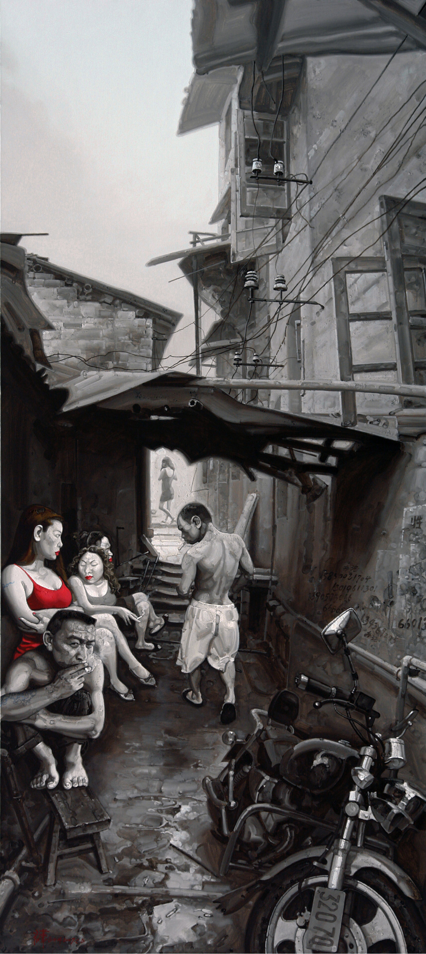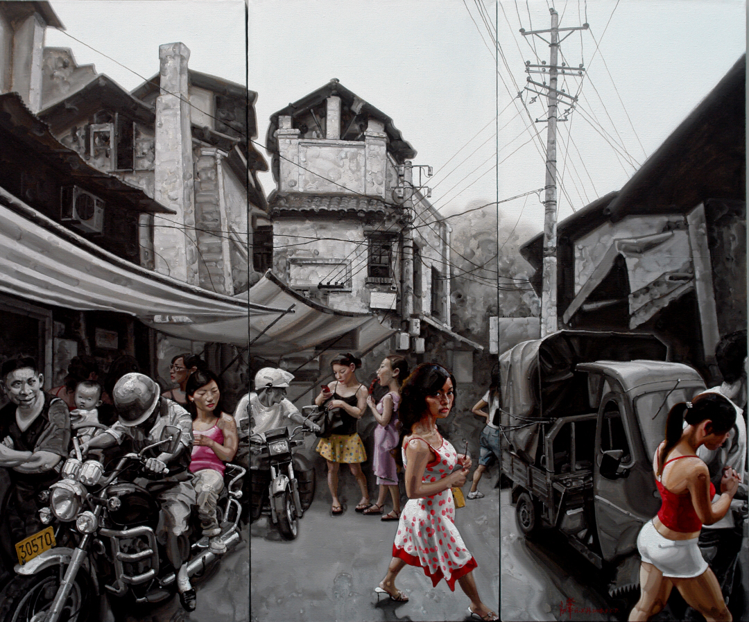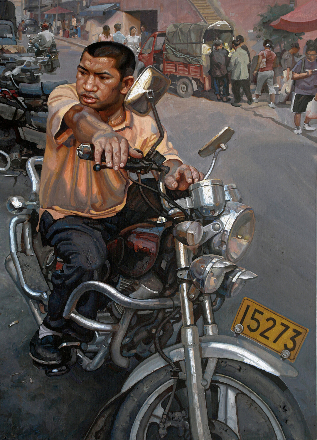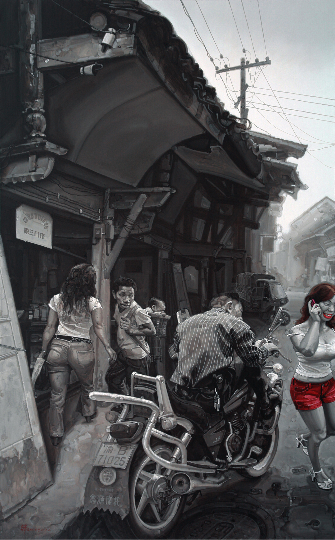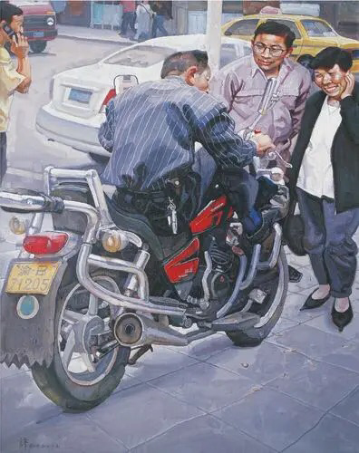 《老街春光》,美女披着金黄色的长发,手持着大哥大招摇过市,小伙子骑着摩托车,一步三回头,小街春光灿烂,令人刮目相看!
