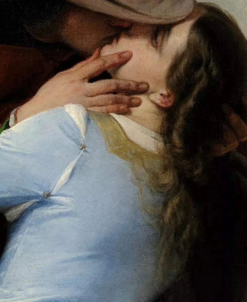1859年是意大利统一运动的关键年,意大利到处洋溢着渴望统一的民族主义情绪,和法国结盟充满希望。弗朗西斯科·海耶兹的委托人希望他以两国的联盟为题材创作一幅油画,然而这样敏感的政治话题又不能直接画出来,于是画家充满浪漫地将法国和撒丁王国的结合演绎为一男一女相拥而吻,令人叫绝。这幅作品后来成为了意大利统一运动的艺术象征之一,至今仍收藏在米兰的布雷拉画廊内!