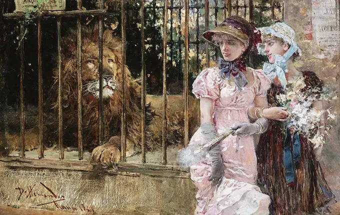 大狮子🦁️关在笼子里太可怜了,两位女郎不要再看了,小心狮子急了,跳出笼子,那你们的花容月貌就尸骨无存了!
