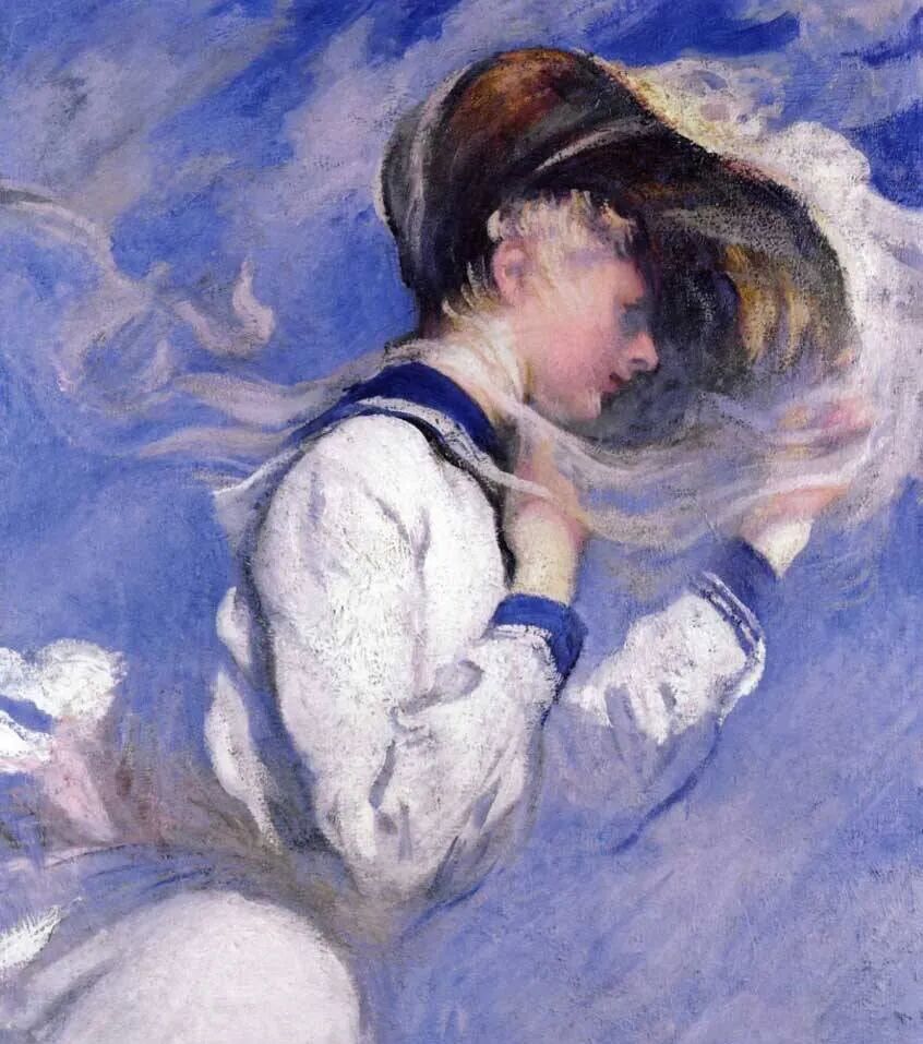 蓝白相间的色彩,水天一色的倒影,扬帆起航的小船,少女蓬松舞动的白裙子,微波荡漾的湖面,画家把她们一起安排在一幅画中,使画面显得格外迷人!