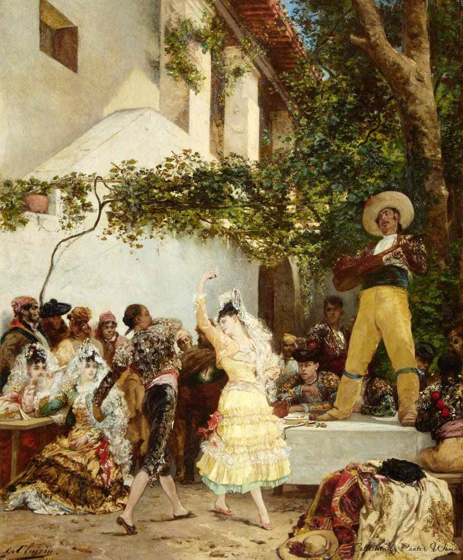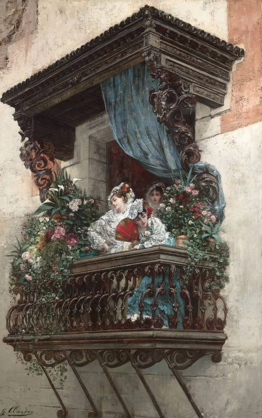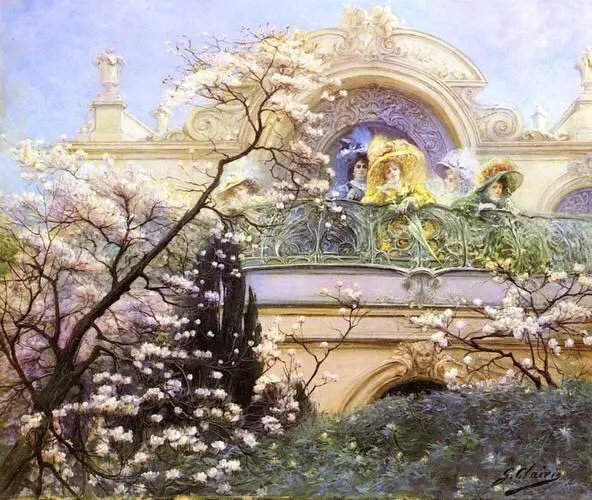 这位画家还特别擅长描绘犹如电影般的场景,在阳台,或者在鲜花盛开的公园,或者在环境优美的郊外,一个个鲜明的人物形象纷纷出场,特别是那些穿着华丽服饰,打扮的花枝招展的太太小姐们,就那么身临其境地站在观者面前!