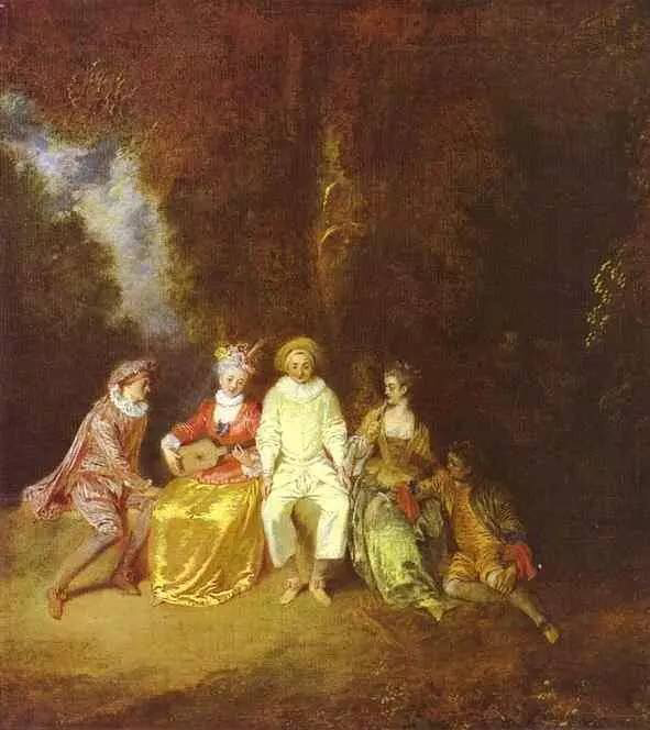 这幅《吉尔斯——哑剧丑角》 是华多去世前为一个剧团创作的巨幅海报。吉尔斯,也就是法国戏剧中的白面丑角皮若特!画中的吉尔斯一身白衣,傻傻地站着,与背景中的很多人格格不入,白色的衣服说明了他心灵的纯洁,他不屑与世俗同流合污,所以最终他变成了一个最孤独的人,一个丑角!