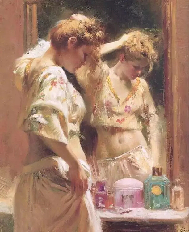 晨曦中,朝阳从窗户的玻璃折射进房间,女孩子日常生活中很平常的一个梳头发的动作,在画家笔下,瞬间变得如此柔情似水,宁静而美好,温馨而浪漫!