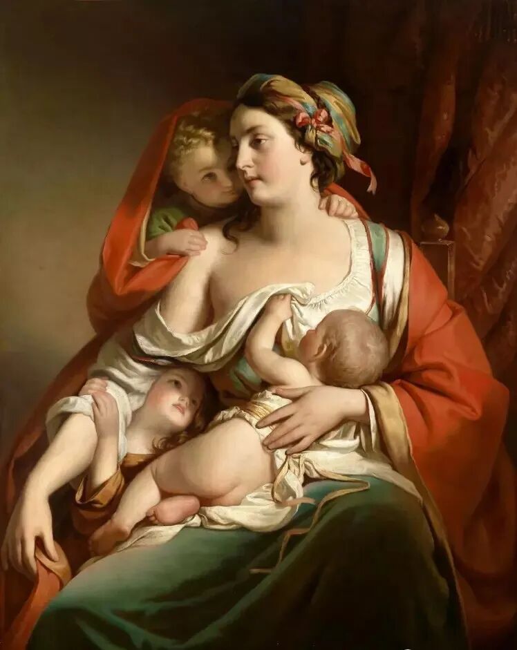 再来欣赏一下这位伟大的母亲,三个孩子,一个正在吃奶,另外二个很调皮,一个抱住妈妈的脖子,一个钻入她的怀里,也许他们都在妒忌弟弟还能吃奶吧!