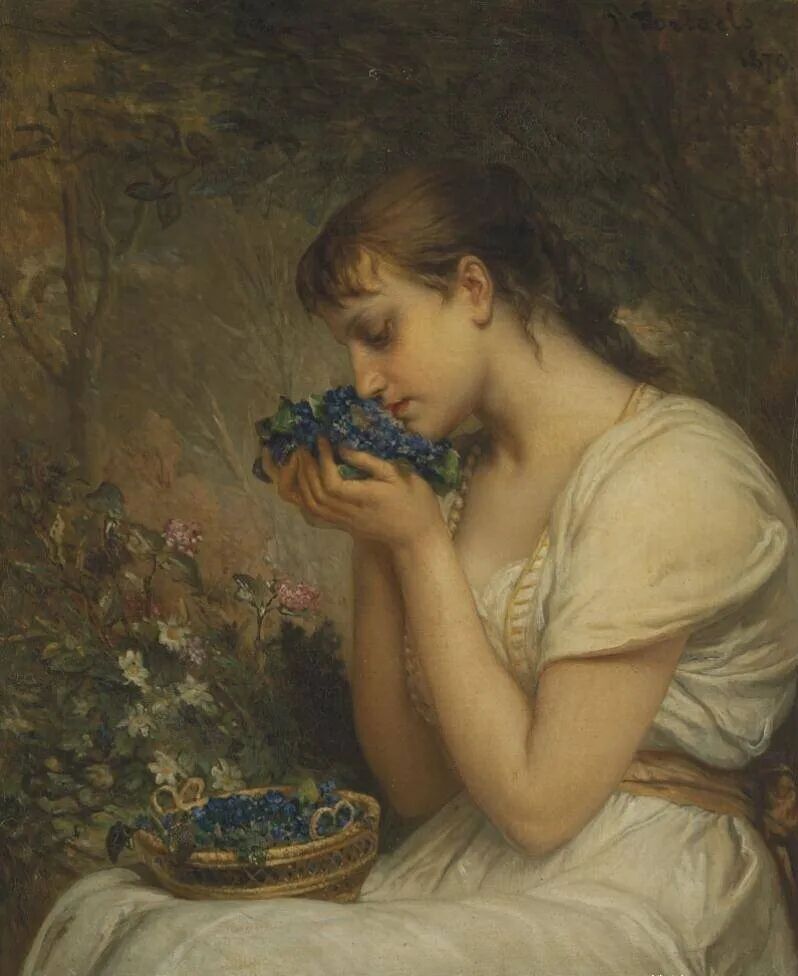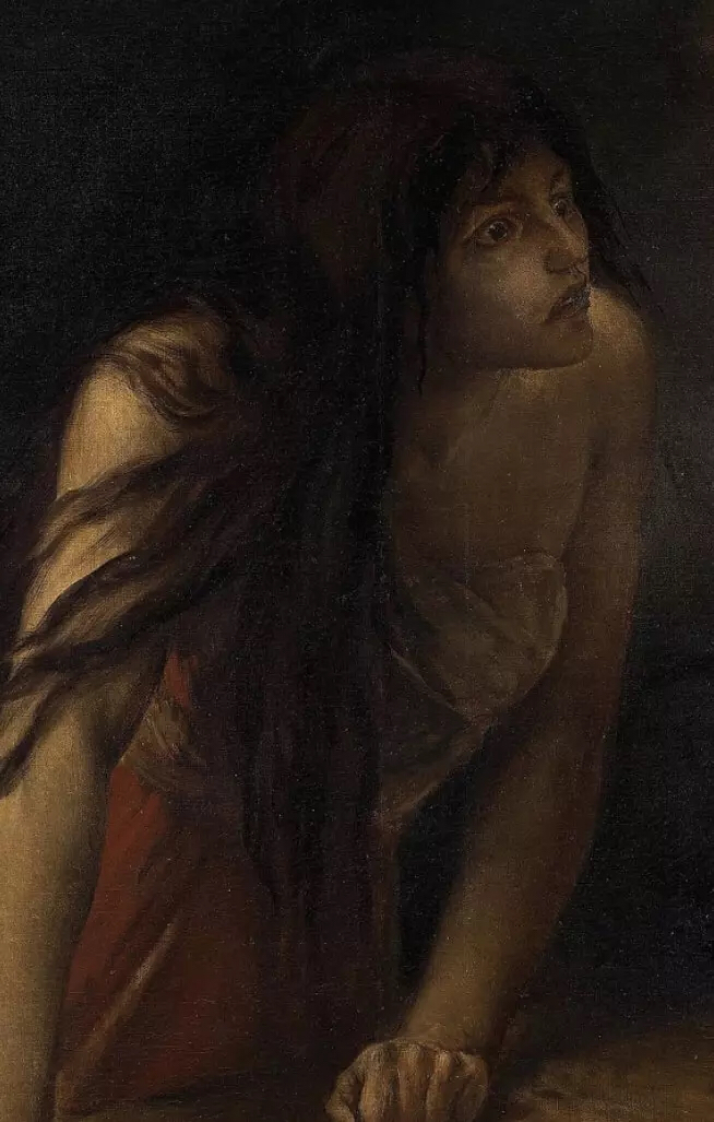最喜欢这幅,少妇黯然神伤、神情呆滞,伤心欲绝,手捧一束含苞欲放的白兰花,还拿着一串佛珠!看到画面右上方还挂着一幅圣母子像,也许这是母亲失去了儿女,或者失去了其他的亲人,一时心灰意冷,要出家修行做修女吗!