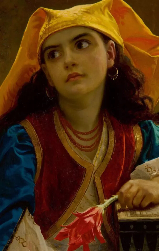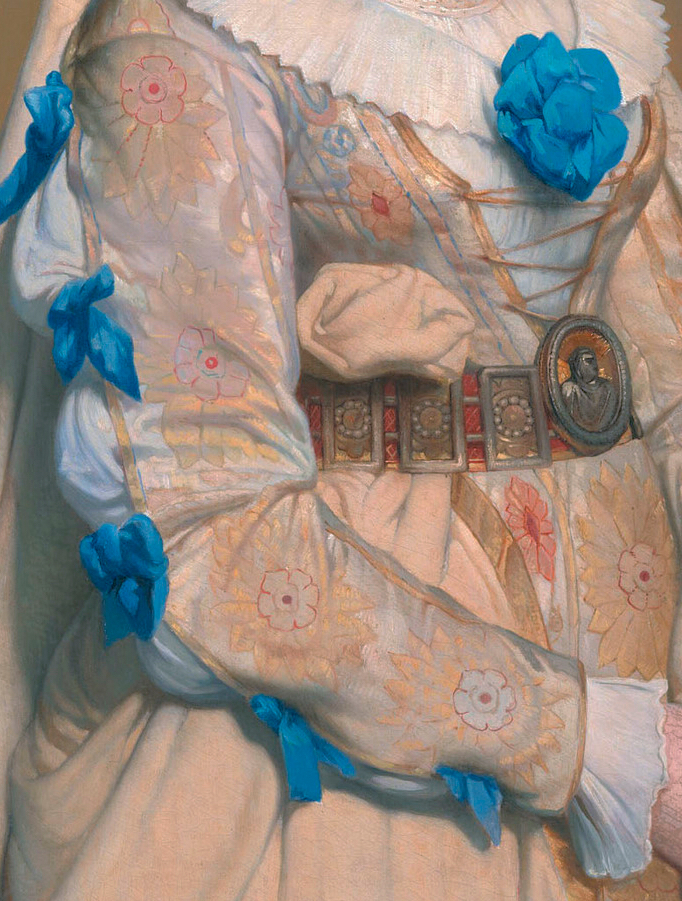 从面部肌肤到女孩华丽的服饰、珠宝首饰等,画家把每一个细节,都刻画得非常细腻精致!