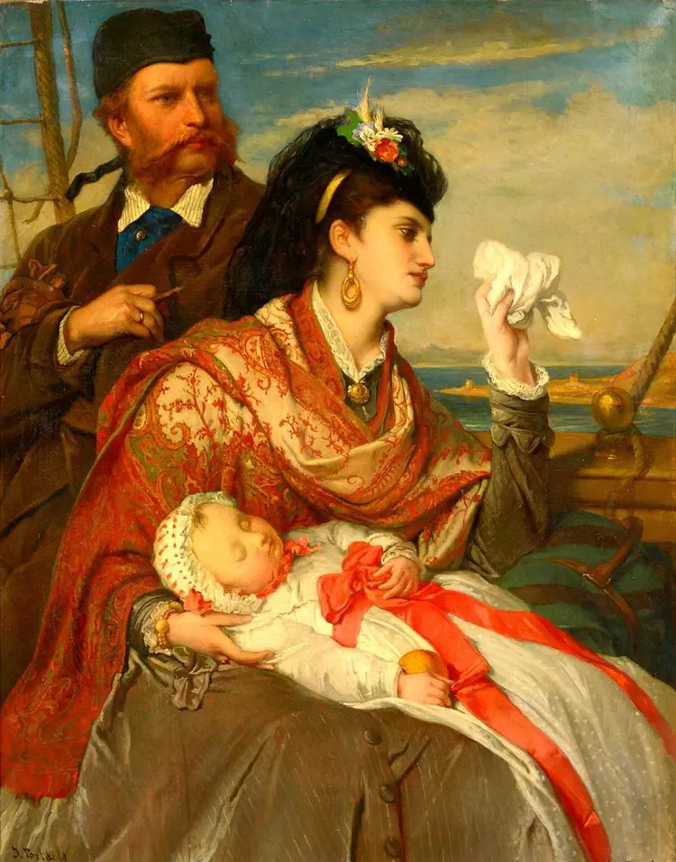 身穿红色披肩的贵妇人在不停地哭泣,眼泪把手里的白手绢都染湿了!怀里的孩子已经永远闭上眼睛,安详地睡着了,估计再也不会醒来了!站在她身后的,应该是她丈夫,无可奈何地望着远方,默默地守护着自己的妻子!男儿有泪不轻弹,他只能把眼泪往肚里咽!
