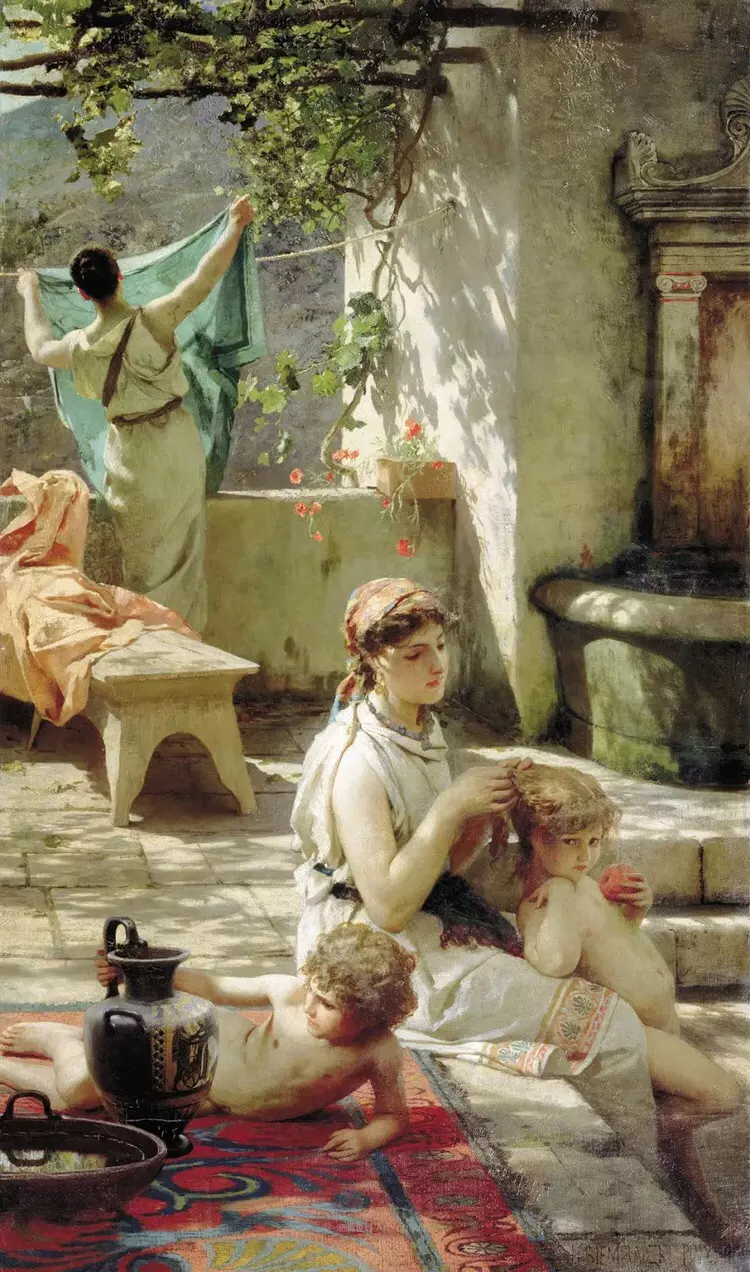 欣赏一下古罗马时代的田园风光,那时候的男男女女安居乐业,生活甜蜜而温馨!阳光明媚,树木葱茏、鸟语花香,空气清新自然,然后大家三五成群散散步、谈谈恋爱、聊聊家常,一个多么美好的时代!