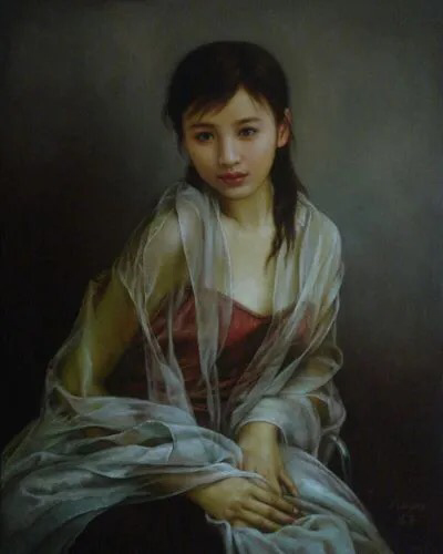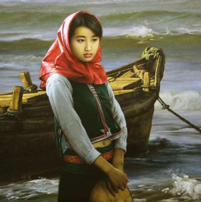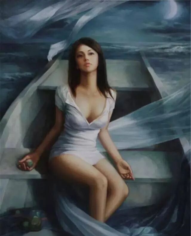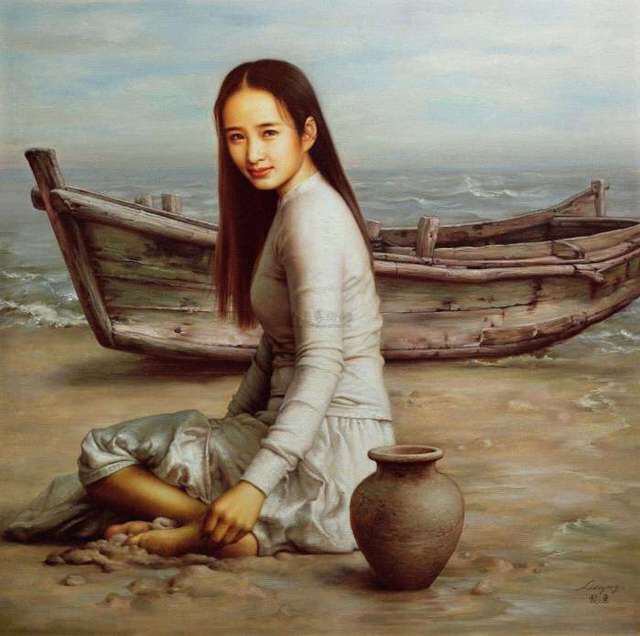 从这些创作的画作中,我们可以看出,这名画家偏爱那种小巧玲珑的,既风韵十足又单纯可爱的女孩!从这些作品背景的小船、小河、竹筏、瓦罐等,就能知道这些女孩都是来自于农家,一般都出落的亭亭玉立、水灵灵的,显得不沾世俗、朴实无华!
