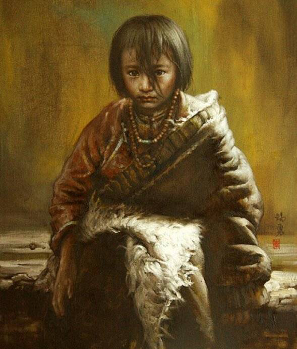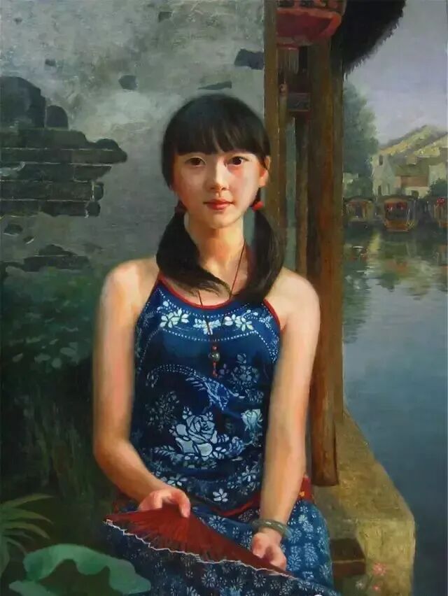 背景是江南水乡古镇,一位扎着两只马尾辫,穿着蓝色印花土布肚兜的小姑娘,坐在河边的水泥墩上,模样清纯可人,水乡女子的温婉、娴静、细腻、轻柔在画布上一览无余!