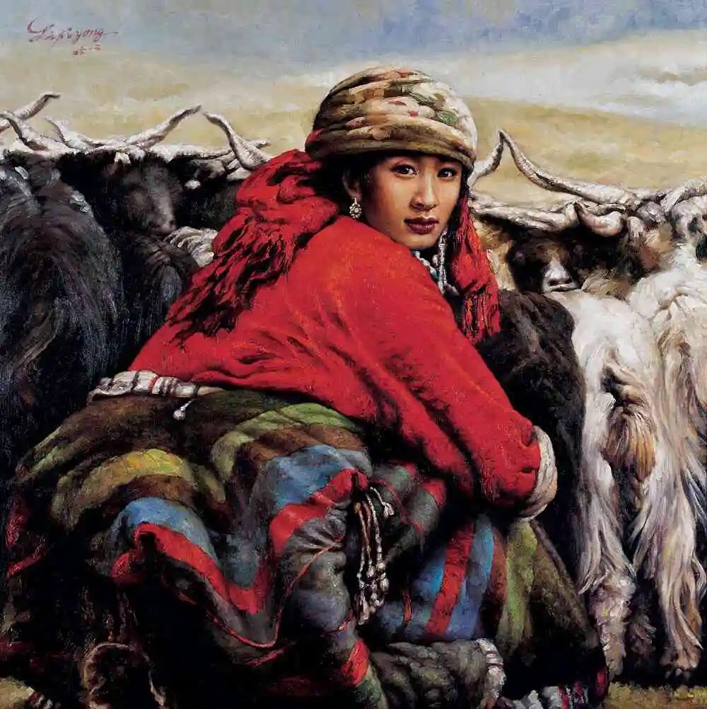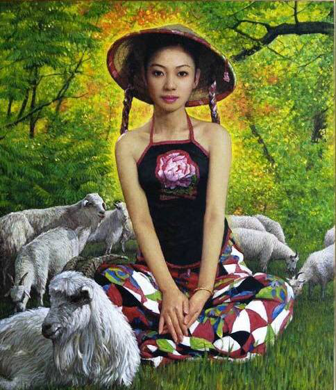 例如这上下两幅都是描绘的牧羊女,一幅背景是青草地,一幅是牛羊成群的大草原,但都市放牧和草原放牧是两种不同的人物形象,无论是服饰还是容貌气质,都绝然不同!