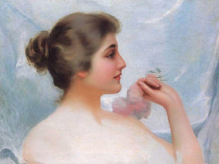 这幅画感觉很唯美,也很浪漫,少女肌肤如雪,手拿一束粉色的鲜花,背景的蓝白色调,则是渲染了一种喜悦的心情!这是哪位帅哥送给你的吗!