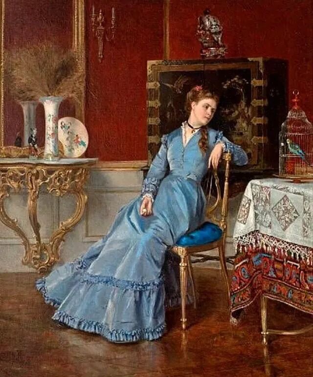 这位画家还特别擅长用蓝色基调来刻画人物从小,要么是蓝裙子,要么是蓝屏风,或者是拥有蓝色条纹的各种搭配!