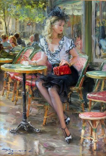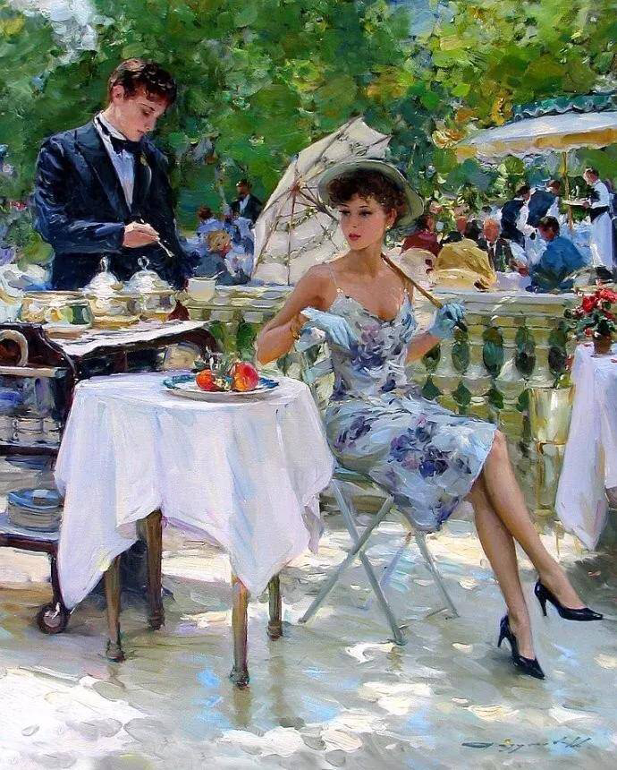 拉祖莫夫刻画的人物形象,服饰华丽,构图完美,光色诱人,色彩搭配、人物的精气神都恰到好处,她们一直行走在春暖花开微风吹拂的季节里,一切都来得刚刚好!这正是让人流连忘返的地方!