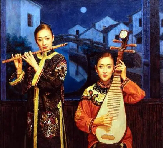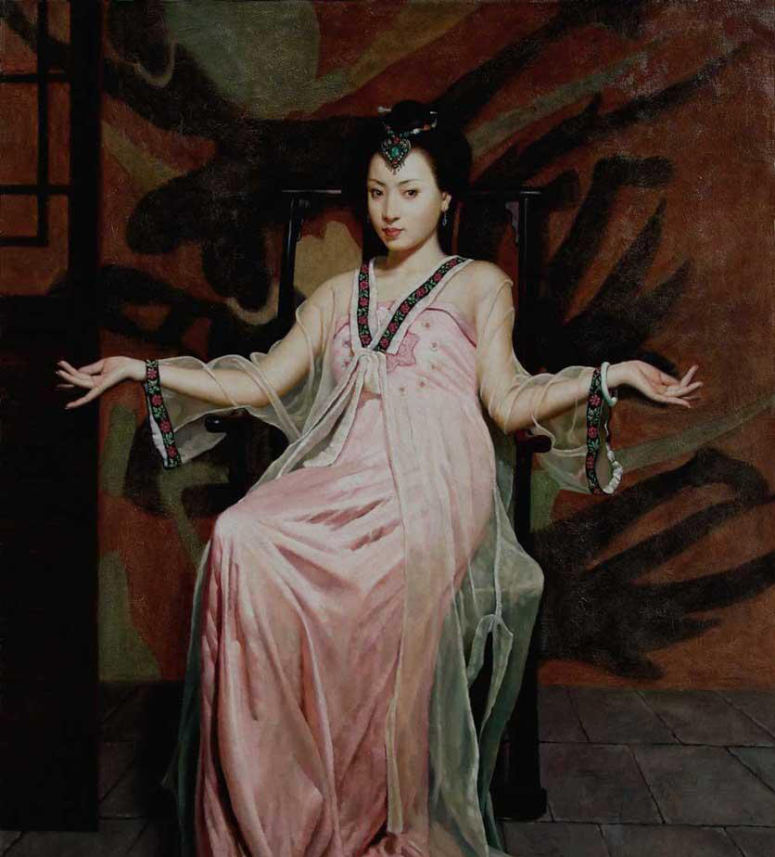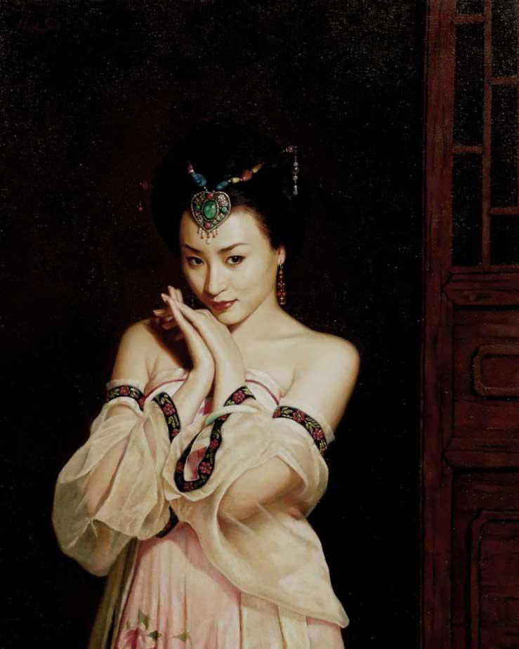 画家把古典女子低眉顺眼的娇羞,刻画得非常生动,背景的暗红色,使少女的出场显得格外醒目!