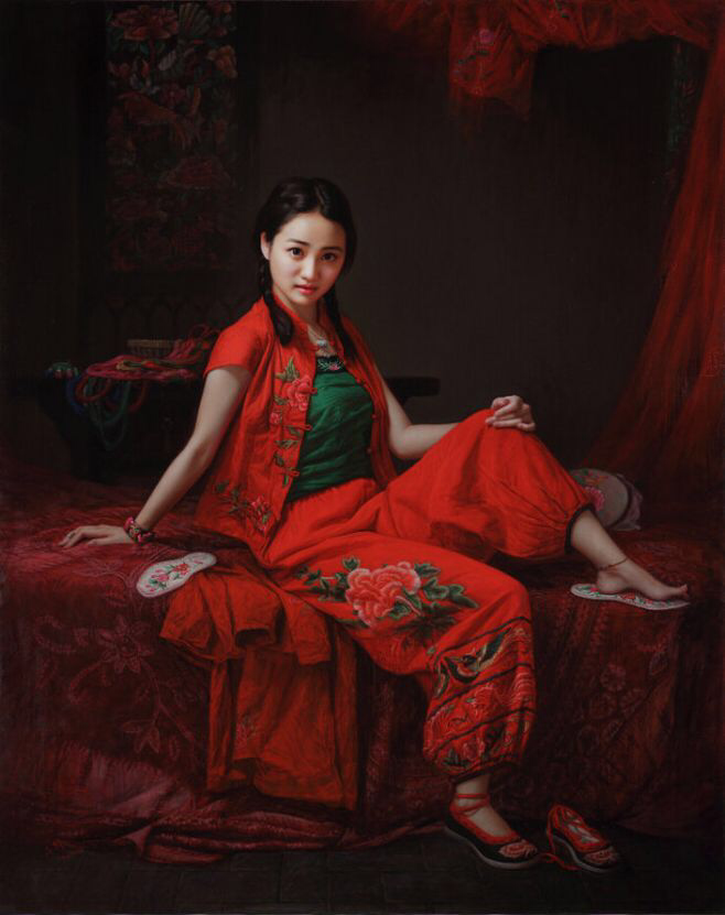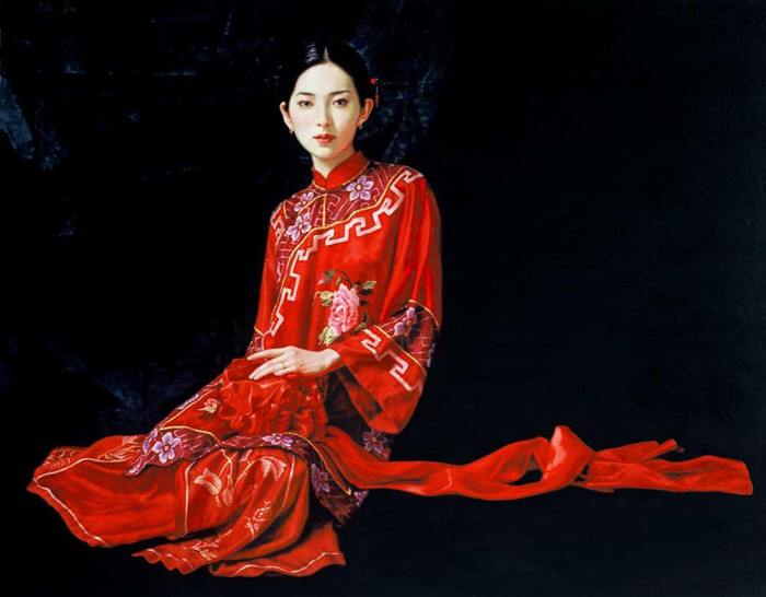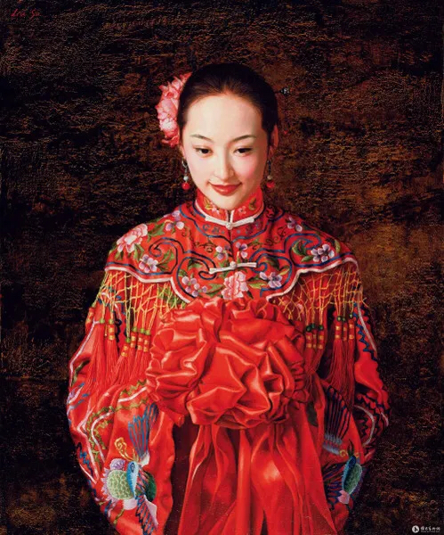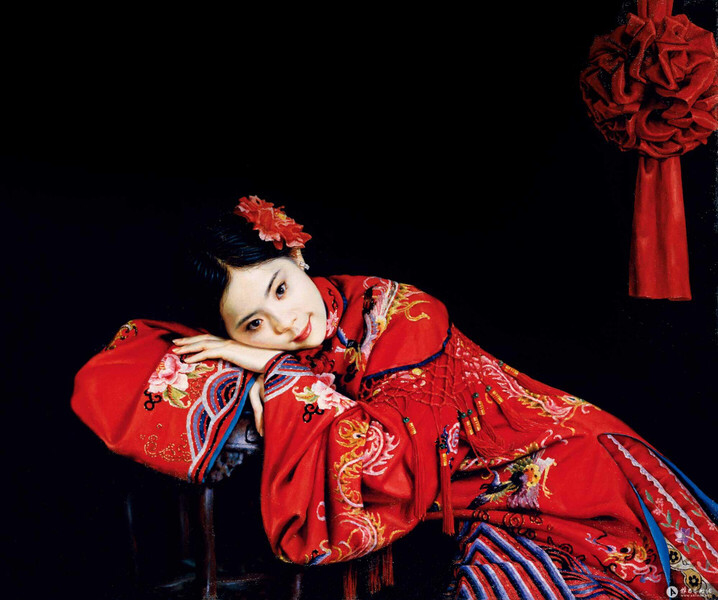 在这些以热烈的红色为主题的作品中,充满体现了刘老师的中国红情结,也代表着画家对中国传统文化的热爱和敬仰!而中国新娘既代表着圆满喜庆,又代表着中国女性的善良美丽贤惠含蓄,以此来烘托传统文化这一主题理想,正好恰到好处!