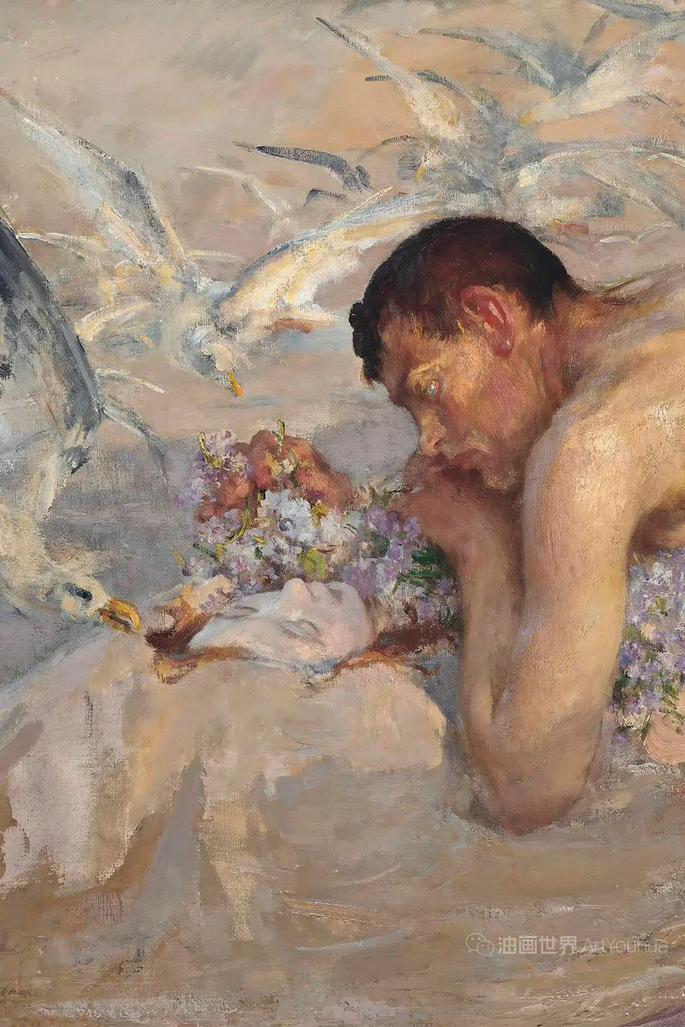 与上一幅美好的爱情相比,这一幅应该是在哀悼爱情的逝去!女孩的生命就像鲜花在渐渐枯萎,而男孩呆呆地看着,伤心欲绝,而却无能为力挽救逝去的生命!这是一幅催人泪下的作品,感天动地的一幅画!