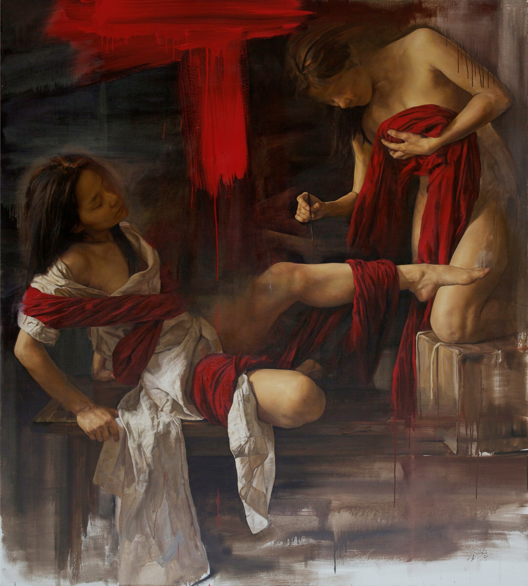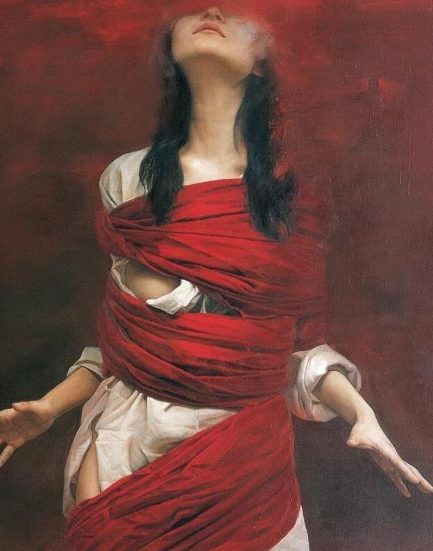 画面上这一条条的红布,把女性层层包裹束缚,不仅是指身体,更主要指内在的灵魂!那究竟是什么东西是女性的最大困扰呢!是生儿育女,是为人妻为人媳为人母吗,还是职场,或者友谊爱情亲情等!