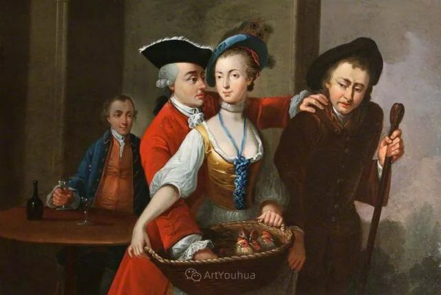 有个市场管理员专门干偷鸡摸狗的勾当,这次又想偷姑娘篮子里的鸡🐔,乘机吃姑娘豆腐,还好这位穿着红色衣服的贵族青年及时赶到,发扬骑士精神,英雄救美,一把按住了对方的肩膀!这下对方尴尬了!画家把这个场景刻画得栩栩如生,如身临其境!