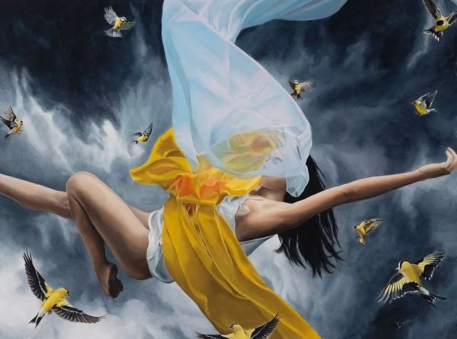 海阔天空任鸟飞,飞过高山飞过大海,当然这只是一种心灵的飞跃,画家以飞鸟作为烘托人物形象的参照物,以这种飞翔的姿态来表达人类心中的向往!