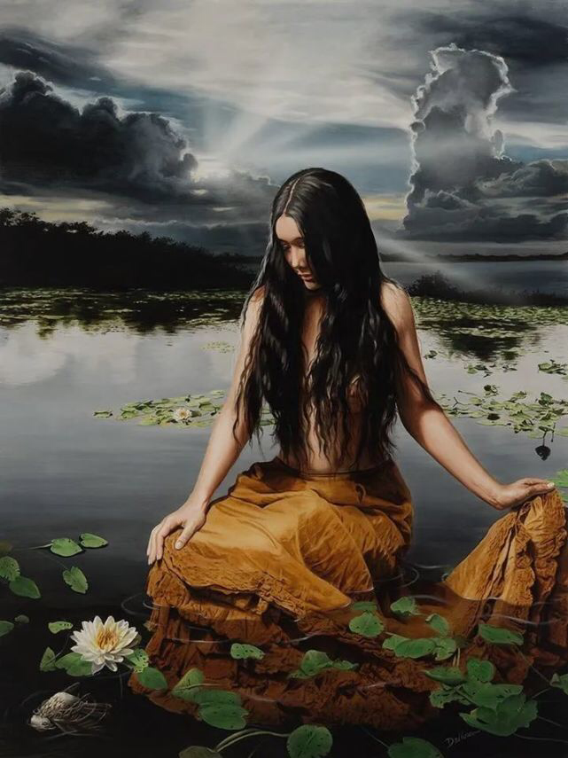 “我是水中一朵莲,出污泥而不染!”这幅画的创意非常好,感觉很有东方情调!莲花一向都是表达东方人的,不过在这里,却是一位西洋长发女郎的内心独白吧,当然也是最大程度展现了她的魅力!