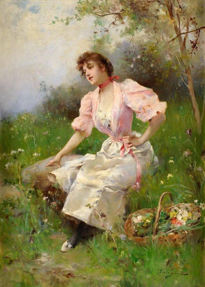 你看这画面上的春姑娘,一大早就奔向大自然中,兴致勃勃地摘了满满一大篮子的小草小花,然后气喘吁吁地坐在青草地里的石头上,满满的幸福感,充斥了整幅画面!