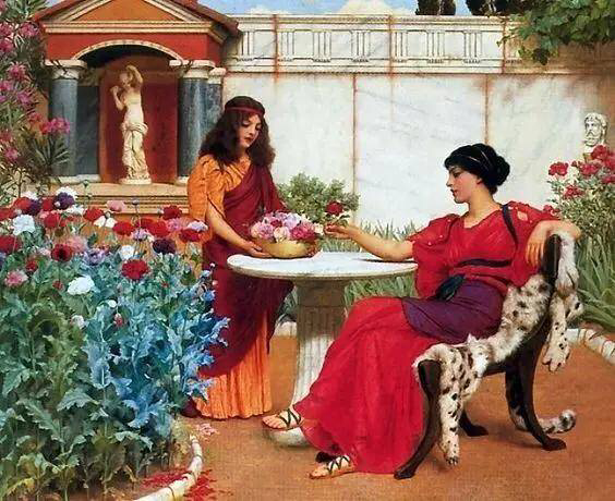 这幅画看起来很普通,画家只是在画布中间安排了一个阳光明媚的春日,一位手捧鲜花的女孩在赏花而已!但画家的高明之处在那张圆桌下面!那位拜倒在石榴裙下的小帅哥,画家让他就这么天天趴在那里,做她的奴才,估计他也是心甘情愿的,毕竟牡丹裙下死,做鬼也风流啊!