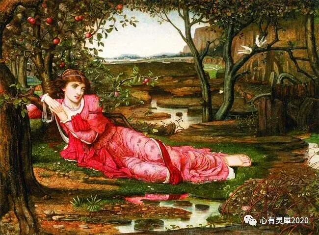《无言的歌》,画面上的女子斜倚在草坪上的一棵树干上,上方有一棵果树,旁边有小鸟在飞翔,也许女子正沉浸在某种思乡的情绪中!这是画家唯一一幅被获准在皇家艺术学院画廊参加展出的作品,这幅画展出之后,引起了艺术界的极大关注!后来这幅画售出之后,他才拥有了自己的工作室,从此就可以安心地专职绘画了!
