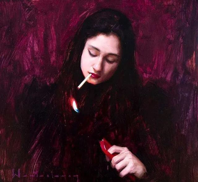 日常生活中很少看到女人吸烟🚬,偶然看到,感觉会非常微妙,欣赏这幅画同样如此,画家笔下的吸烟女人竟然如此有深度有魅力,感觉人生的各种阅历、体验、感悟、千言万语都体现在这个点火🔥的瞬间!
