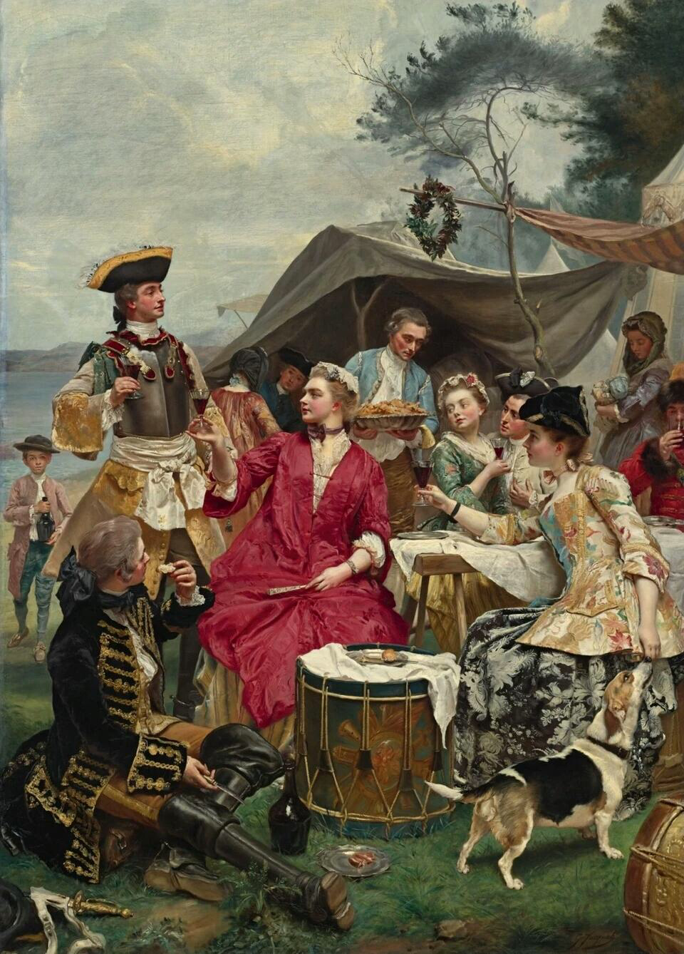 这位画家对场景的塑造也是栩栩如生,看男男女女精致的妆容和服饰,画面应该是描绘贵族子弟们在郊外的一次露营⛺️野餐!有临时搭建的帐篷,草地上有烧烤炉,还有跟随的仆人等!