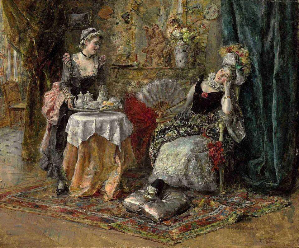看看室内的豪华装饰,华丽的地毯、窗帘,银质餐具套装,墙上不知是什么价值连城的古画,女主人看起来非常高兴,托着腮在想着什么开心的事情,女佣也跟着享福了!