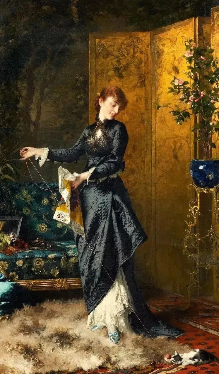 贵妇人和小猫玩毛球,这牵线的动作给画面增添了动感的视觉体验!仔细看其黑白分明的衣裙和猫的颜色是最佳搭配,感觉如情侣装!