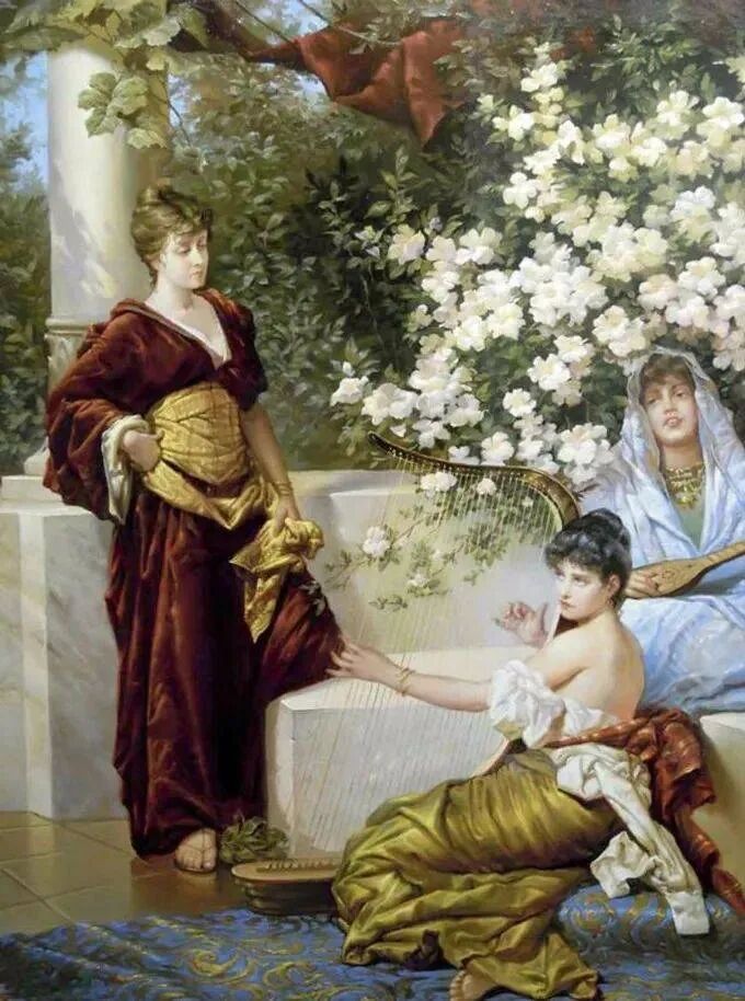 而这几幅画就完全不同了,风花雪月,弹琴赏花,花美人美歌美,整幅画面都令人感觉心情愉快!一边欣赏,一边自己的心情也好起来了,这就是艺术的魅力!感觉多看这种作品,自己会越活越年轻!
