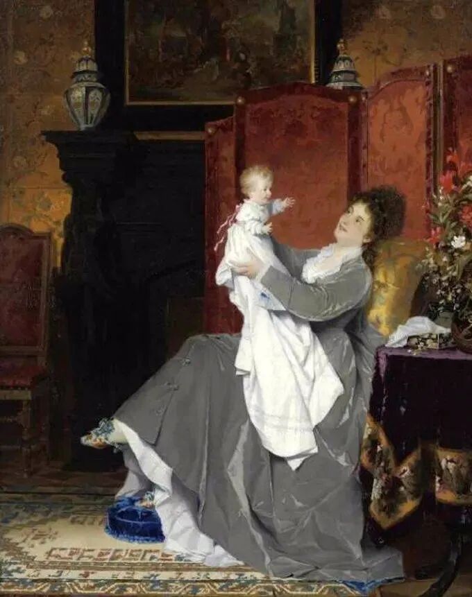 这个襁褓之中的婴儿太可爱了,胖胖的小手太生动了,母子连心,画家把母子之间的眼神,刻画得惟妙惟肖,感觉这小孩子和小编儿子小时候一模一样!