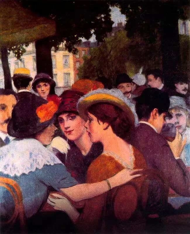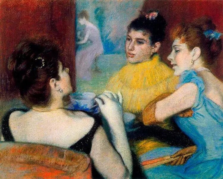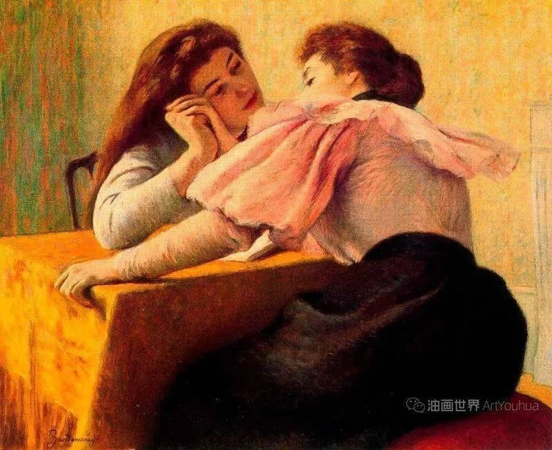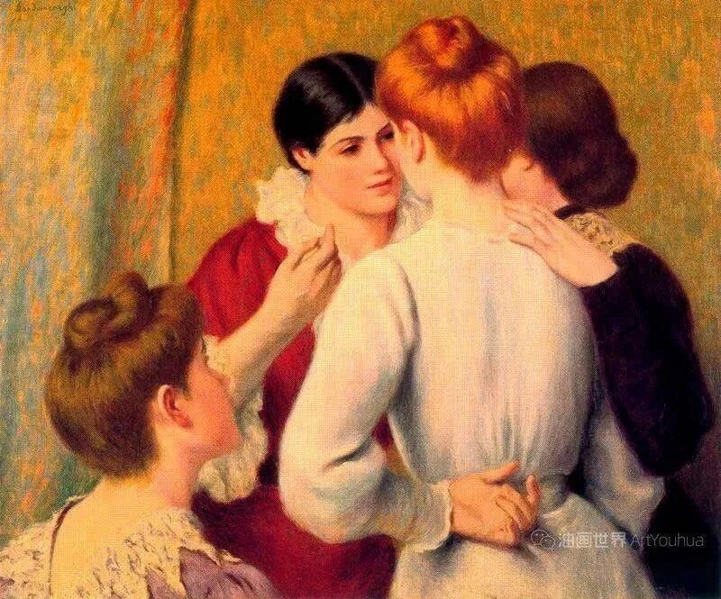 这一幅的人物形象具有真实生动的互动性,有一点写实主义风格的成分!人物站立的位置,还有言行举止、暖色调的光线,都烘托了这四个女人谈话的融洽氛围!