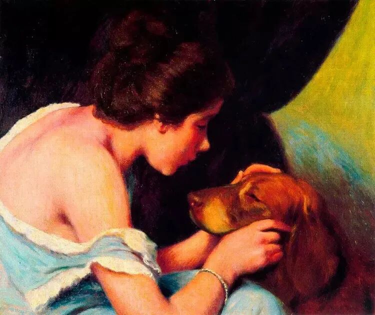 养孩子,你从小含辛茹苦养育,说不定长大了对你吹胡子瞪眼!而狗狗绝对不会了,你看画中的女人和狗,好感动好温馨的一个场景!