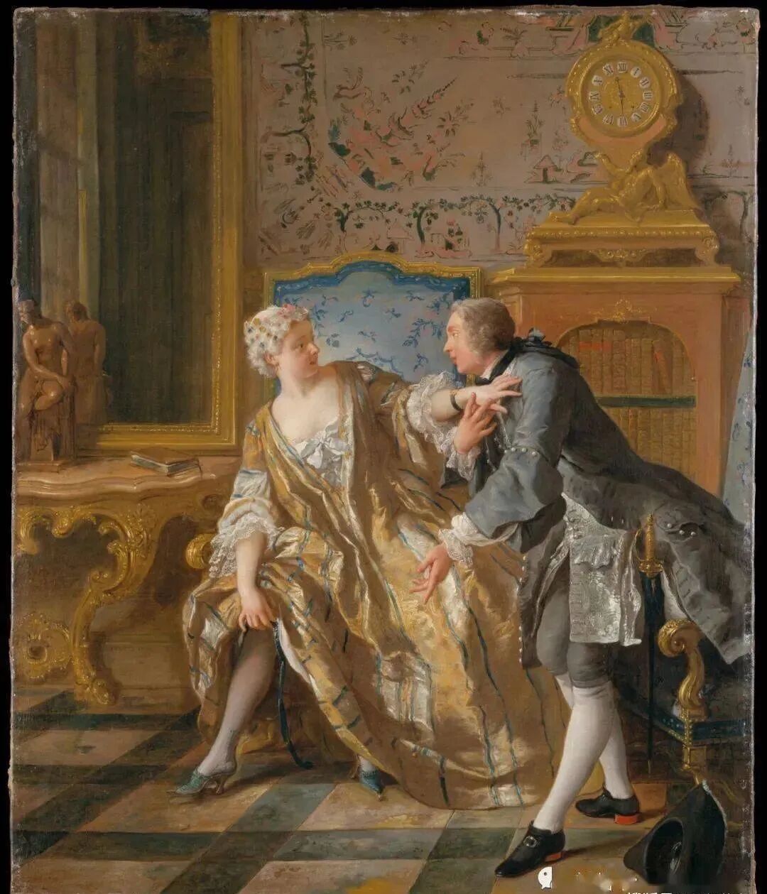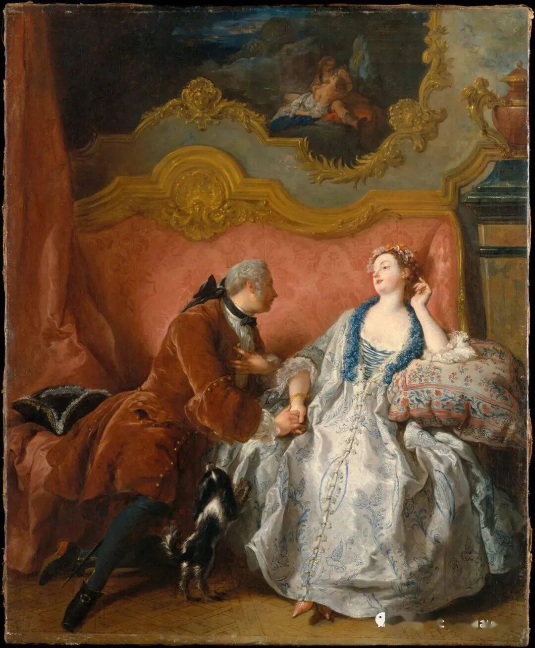 这是一幅典型的洛可可风格油画,言行举止有些轻浮,有些浪荡,不过在当时却是非常流行,对于男女之间的风流韵事,也没有过多的道德观念约束!相反有夫之妇或者有妇之夫拥有情人,那也是一件很时髦的事情!