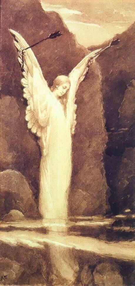 丘比特之箭射中的天使,那就会被爱情所困扰羁绊,就失去了自由翱翔蓝天的心境!古往今来,有多少男女会困于情,而不能自拔!不知道画家是不是表达这个象征意义,还是描绘的神话传说故事!