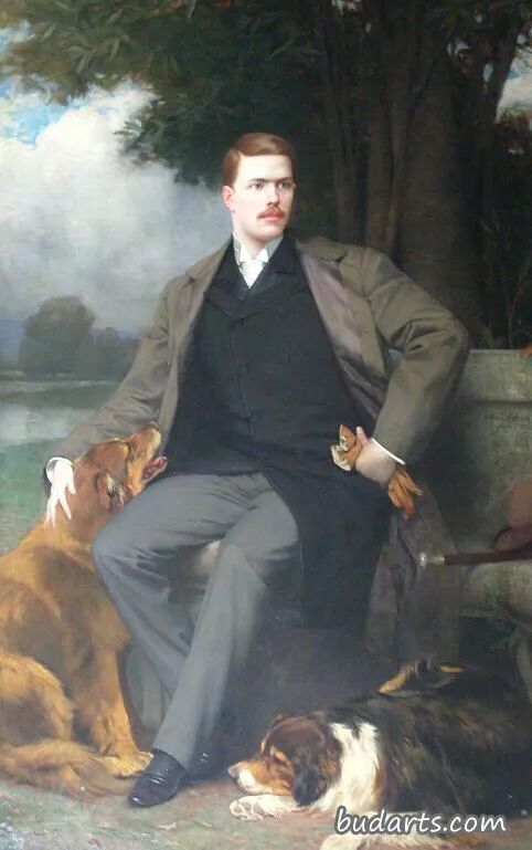 《詹姆斯坎贝尔肖像》,男士也刻画得很帅,脚下的两只大狗也很乖巧,画面既展示了他的高贵身份,也描绘了他的绅士风度!
