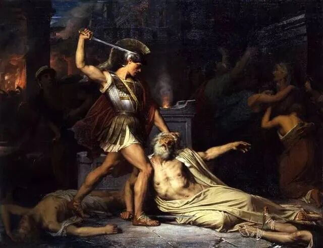 普里阿摩斯也就是特洛伊国王,国家沦陷之后,国王就成了过街老鼠、阶下囚,画面就是展示了敌方一位年轻的将军将要举刀砍向满头白发的普里阿摩斯的场景!曾经高高在上,呼风唤雨,不可一世,如今就只能成为粘板上的一块大肥肉,任人宰割!
