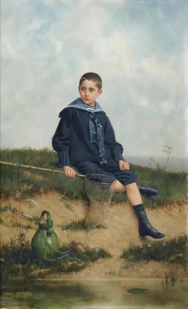 这幅男孩在河边用网兜捞鱼的场景,大部分原因估计是来自于画家偶然从内心深处冒出的童趣,估计那是他小时候曾经干过的事情!因为小编也喜欢去河边捞鱼,尽管已经老了!下面一幅是画家的自画像!
